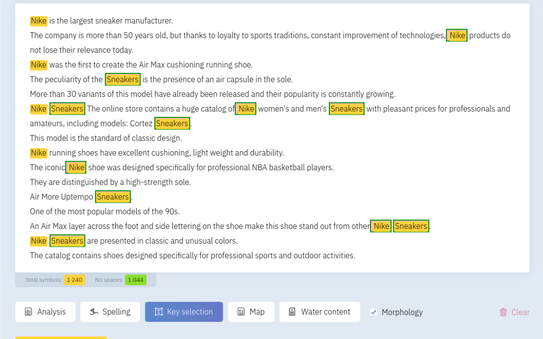 Istio автоматично підраховує кількість символів, перевіряє «водяність», виявляє перенасичення (keyword stuffing) та відображає результат у зручній формі.